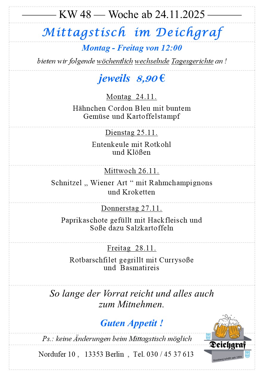 wöchentlich wechselnden Tagesgerichten an (jeden Sonntag neu, hier die folge Woche) !
