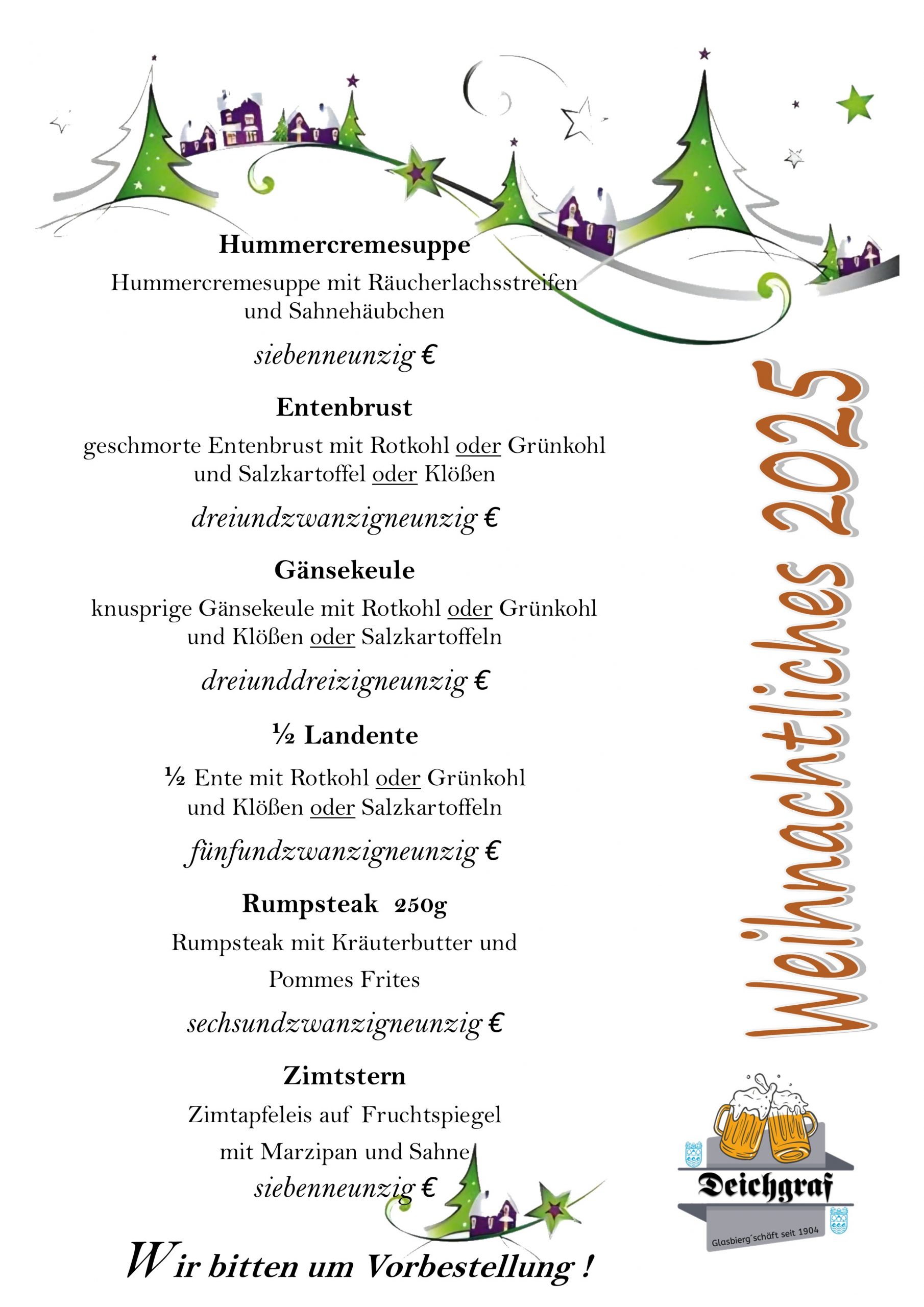 Wir bitten aber wenn möglich bei Gruppen ab 8 Personen um Vorbestellung der Weihnachtsessen!